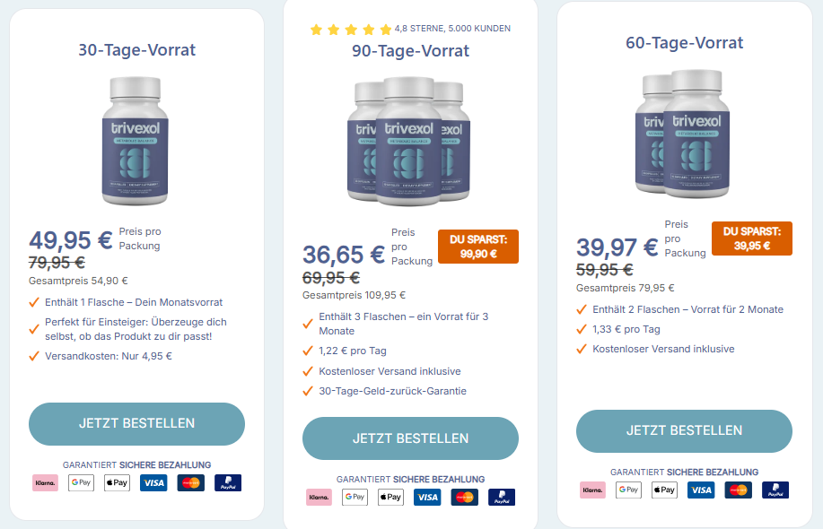 Der Kauf über den offiziellen Shop wird empfohlen, da dort Originalware, transparente Preisgestaltung und oft Sonderaktionen bzw. Geld-zurück-Garantien angeboten werden. Trivexol ist in normalen Apotheken oder auf großen Marktplätzen wie Amazon in der Regel nicht verfügbar.